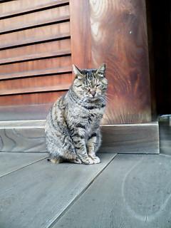 神社猫2匹のうち、いつも後から登場するキジ猫の『コゲちゃん』です。女の子ですよ。ねっ嫌そうでしょ、カメラが。