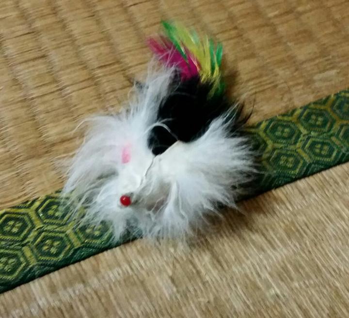 ネズミのぬいぐるみがついていたのですが、設置二分でオセロさんに引きちぎられる。