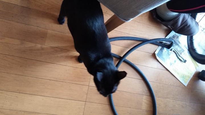取り外したタイヤチューブを咥えて持って行こうとする美雨様。