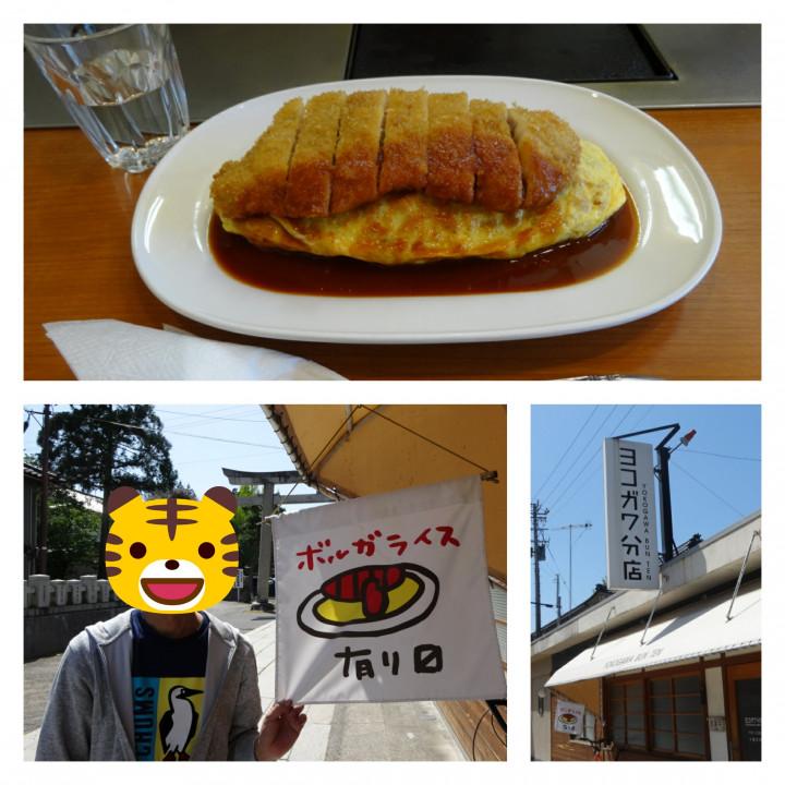 オムライスの上にトンカツが載ってて、味付けがケチャップともデミとも言いがたい感じ😊