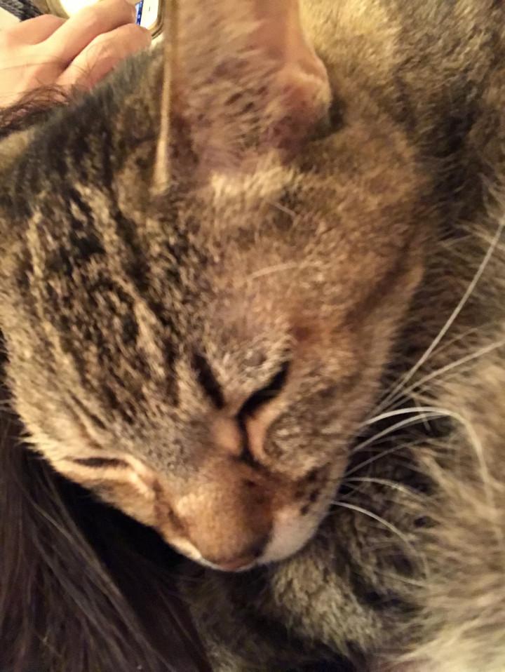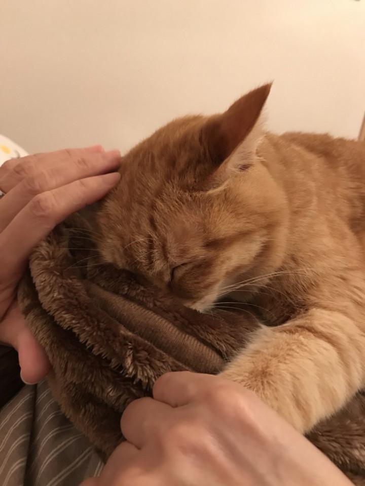 次は私の頭の上に頭を乗せています。アンアンです。アンアンも安心なのか、私も幸せを感じます。チビ達二匹はたぶんこの時は一階二階を走り回って遊んでいると思います。