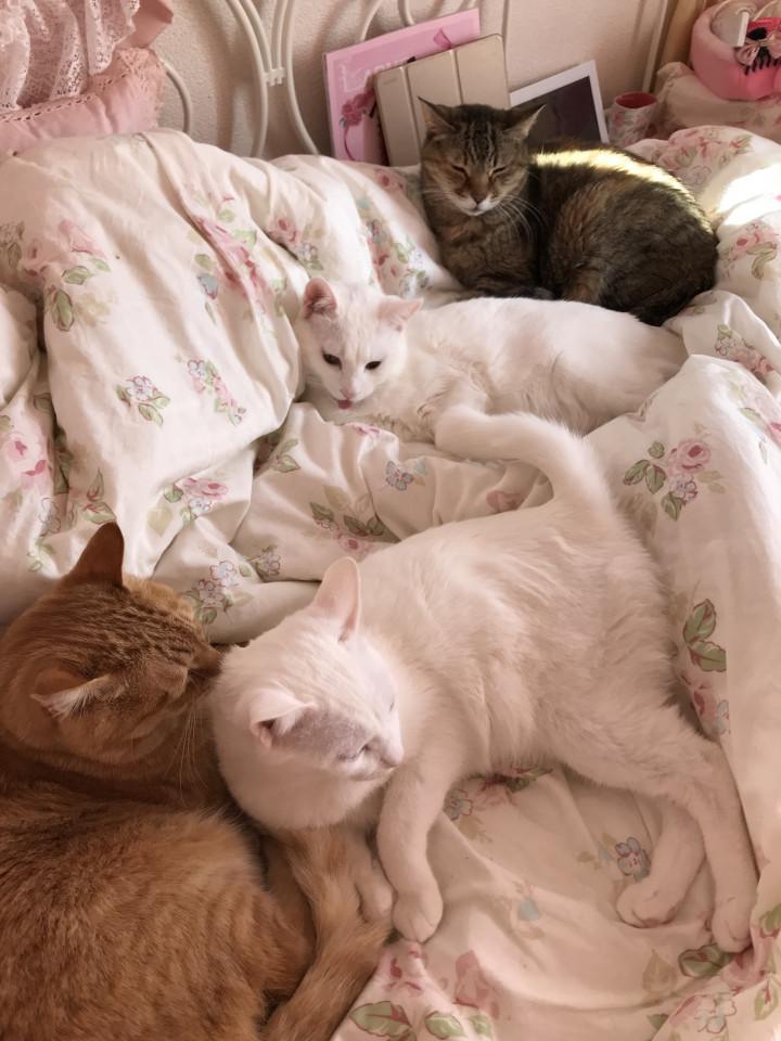私のベッドで皆んなで寝ています。仲良しこよしだよ❤️