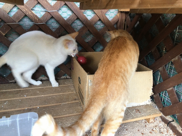 今日の主役、茶トラ君、白君、なんといっても個別にもらえた初めてのオモチャ。