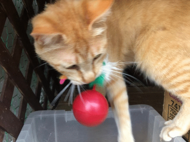 パウチを食べ終わった茶トラ君、思いっきりおもちゃで遊ぶ!