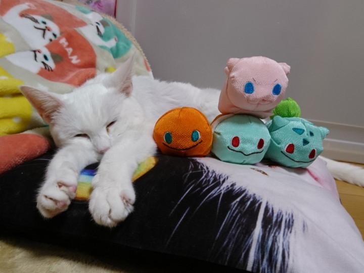 クッションの上でおててをのび~して寝てたとこに、ポケモンお手玉を並べました。