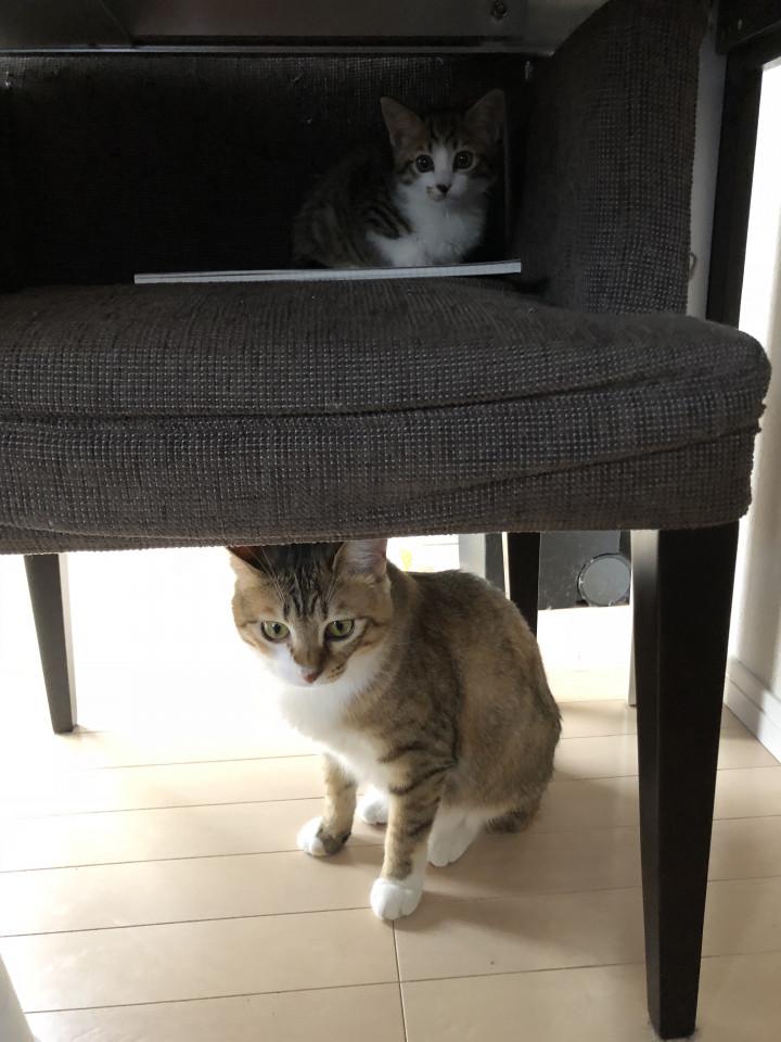 椅子の下に避難してるー!