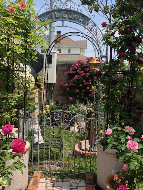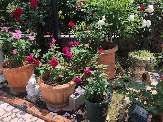 石が敷きつめてあるお庭なので、沢山の鉢植え薔薇がありました。