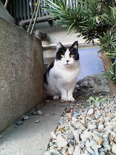 お寺の石灯籠の横で出会ってしまった黒白猫。猫も驚いてたけど、こっちもビックリです。なかなか良い感じの鉢割れ模様だね。
