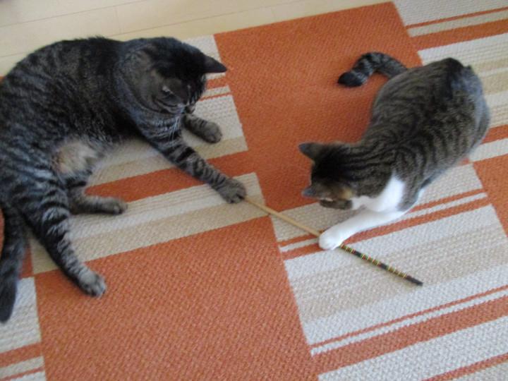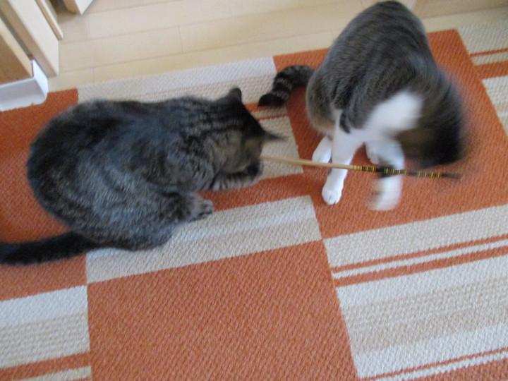 もうちょっと遊んでもらいたいので、私が菜箸を使って取ろうとしたら、今度は菜箸にロックオン‼