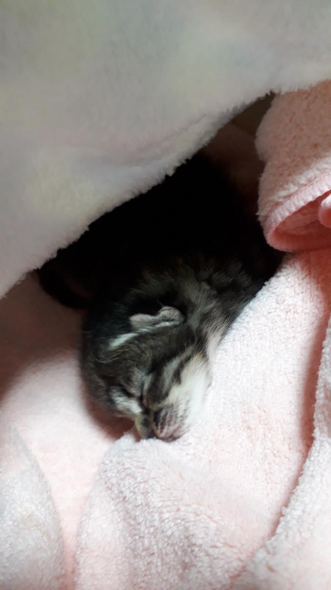 動物病院にて、栄養剤を打ってもらい少し楽になった様子。5/12~16くらいに産まれたのだろうと推測。この時期母猫がいないとかなり厳しいと言われる。