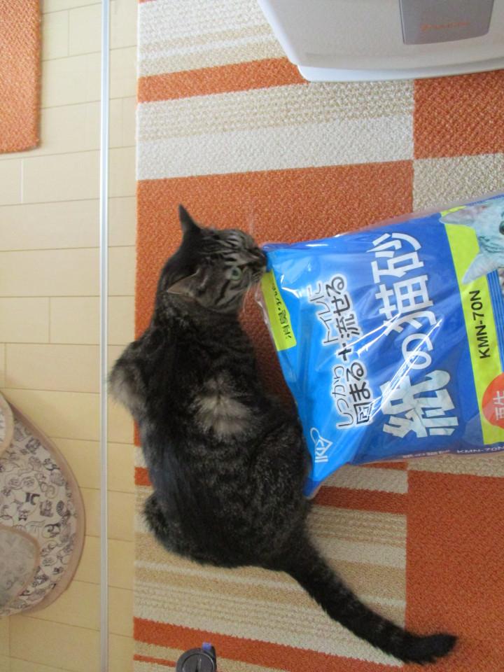 乾拭きして戻ったらハナが猫砂の袋をガジガジ‼これも恒例、無視して続けます😉