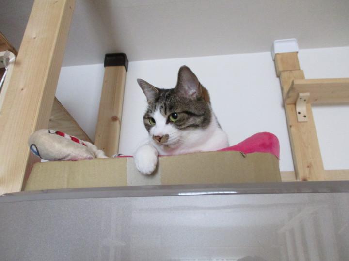 冷蔵庫の上で寝ていたハルを見てみたら、手抜きがないかちゃんとチェックしてました👀