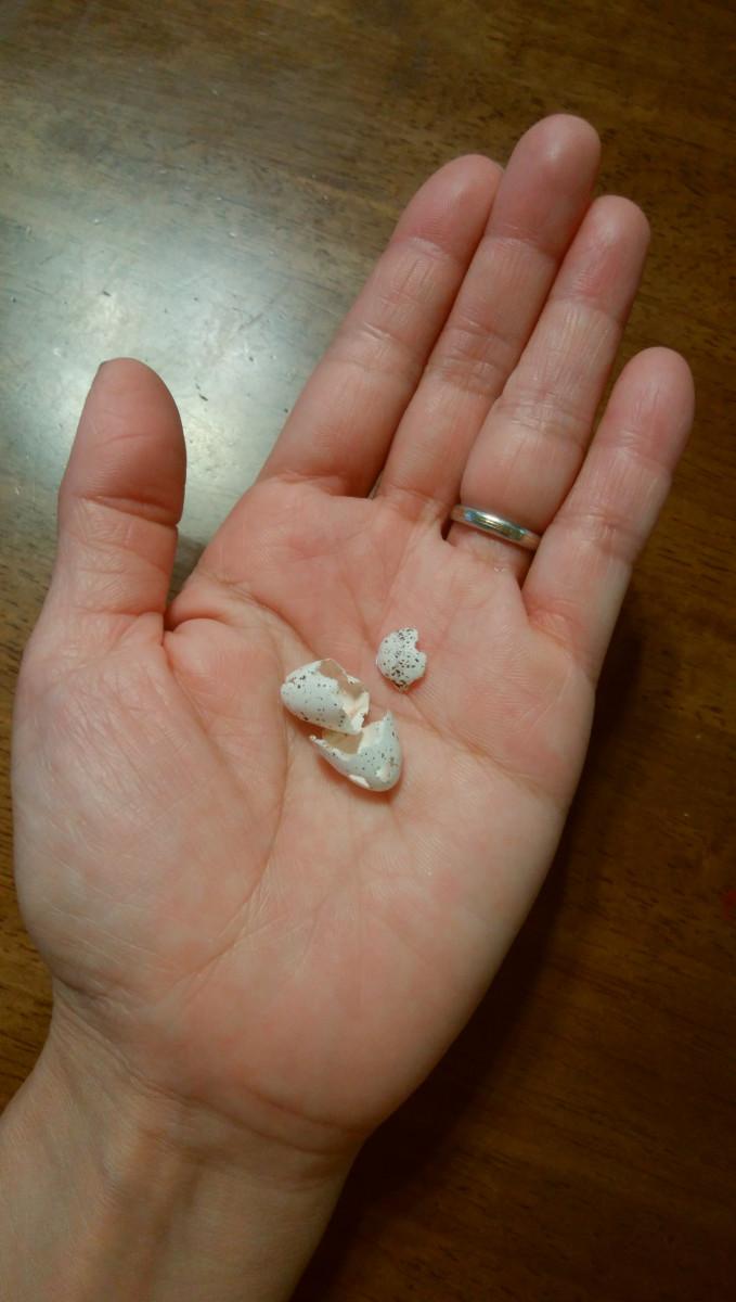 お母ちゃんが今朝見つけた、ツバメの卵の殻ですって。