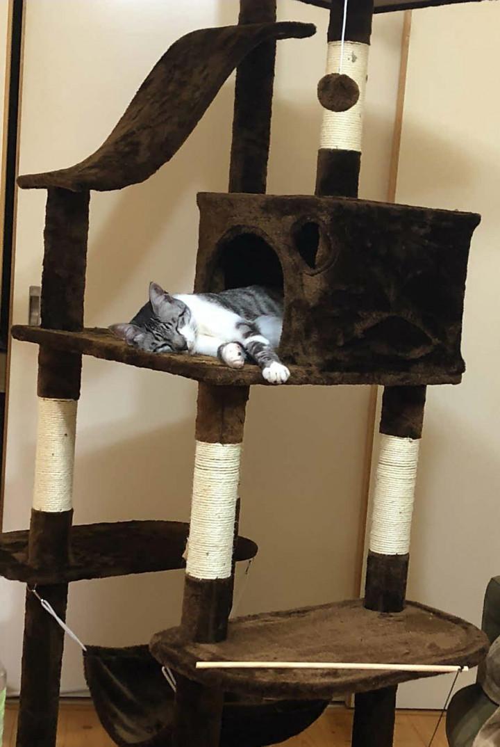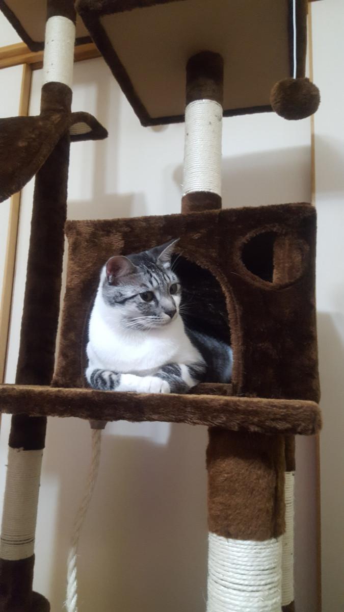 タワーが入ってた段ボールにinして~匂いを嗅ぎに来て~窓際でお外観察して~しばらくすると寝てました💧
