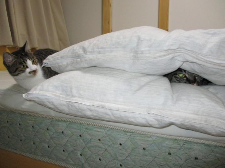 それでも何とか飼い主の強制執行でカバーを付け終わり、掛け布団を二つ折りにして、はい、終了ヽ(^o^)丿