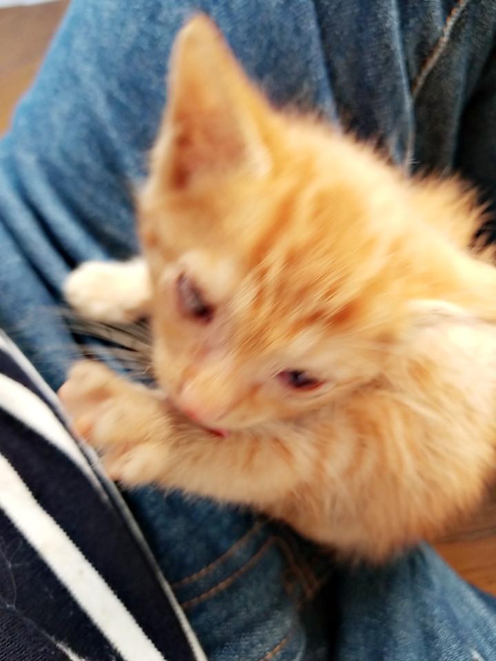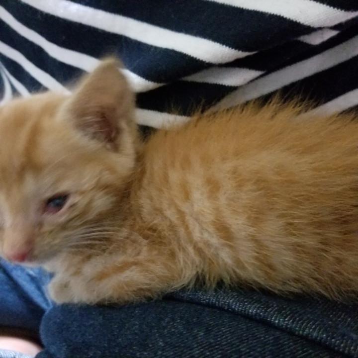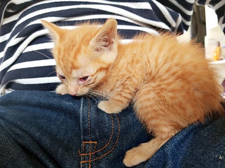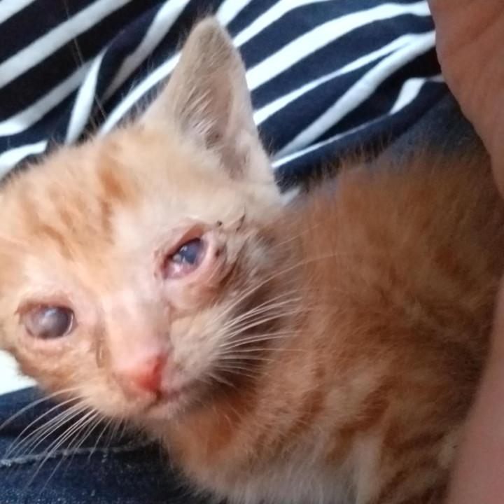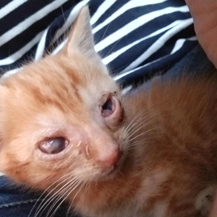 右目の眼球が少し飛び出していて、白くなり失明しています