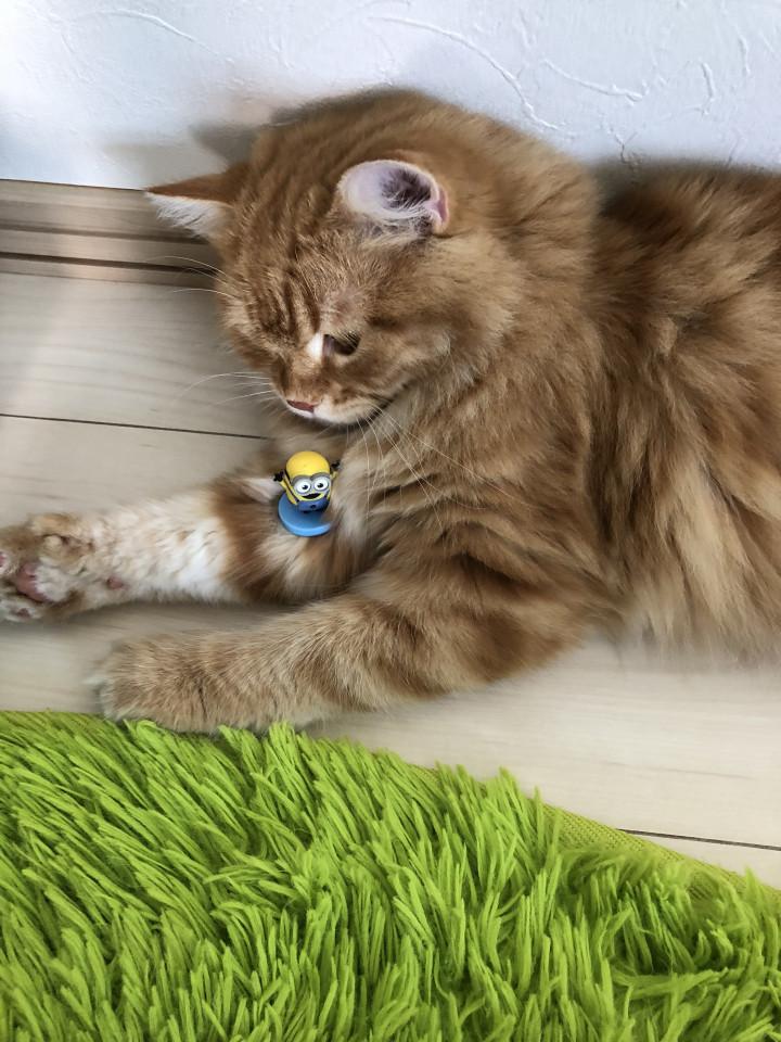 フードに居たら、近所の飼い猫さんがお散歩しに来て、フーッ❗️💢と、されたので、家の中で遊ぼうねと、ミニオンと遊ばせていた(*´∇`*)