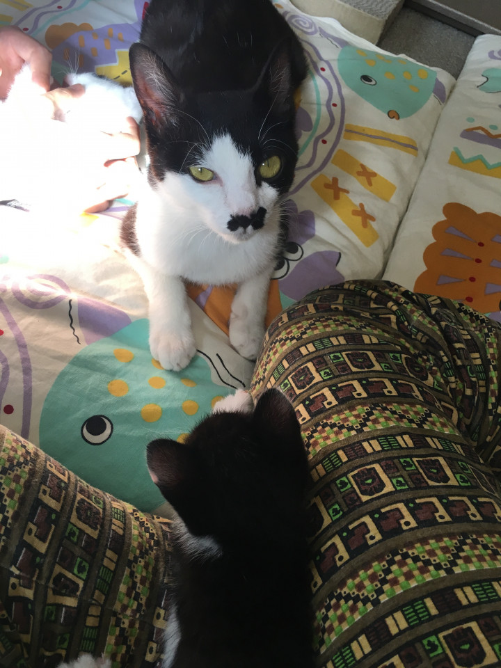 ↑下痢から解放された親猫くろちゃんと、わんぱくにこちゃん