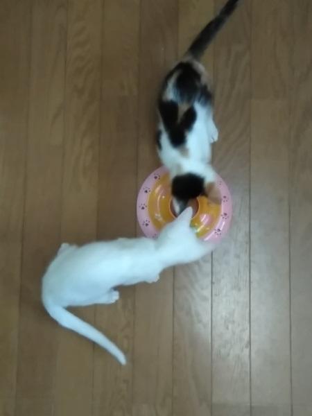 新しいオモチャを投入したので、興味津々のガラコと王子