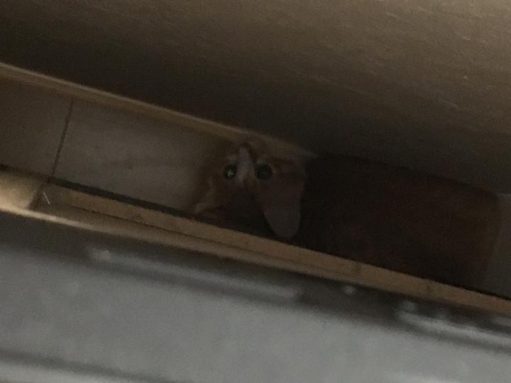 玄関の傘立てが倒れていたので直しに行ったら、その隙間にチャタロウが!