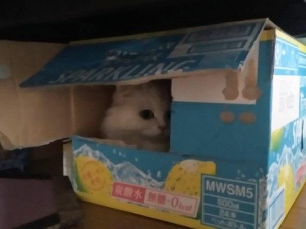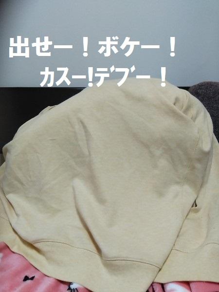 出せだせと騒ぐので、私のパーカーで目隠し。