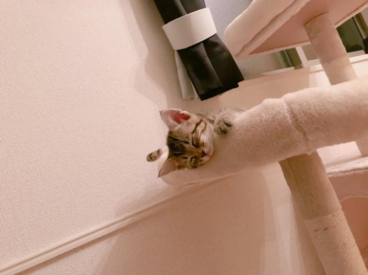 キャットタワーで寝るのが定番になってきたみたいです😪💤