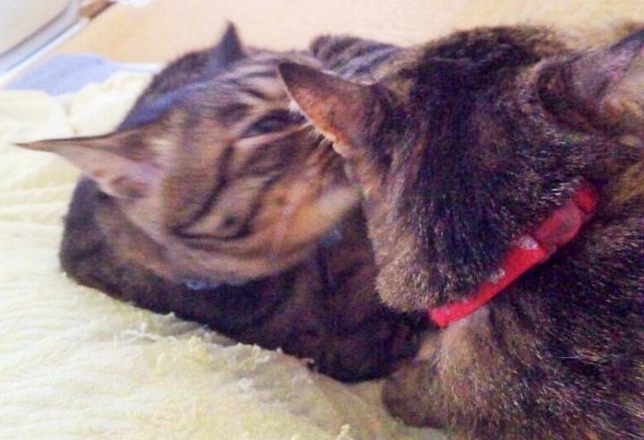 私に寄り添ってきたマロコちゃんに必死で毛づくろいする兄。