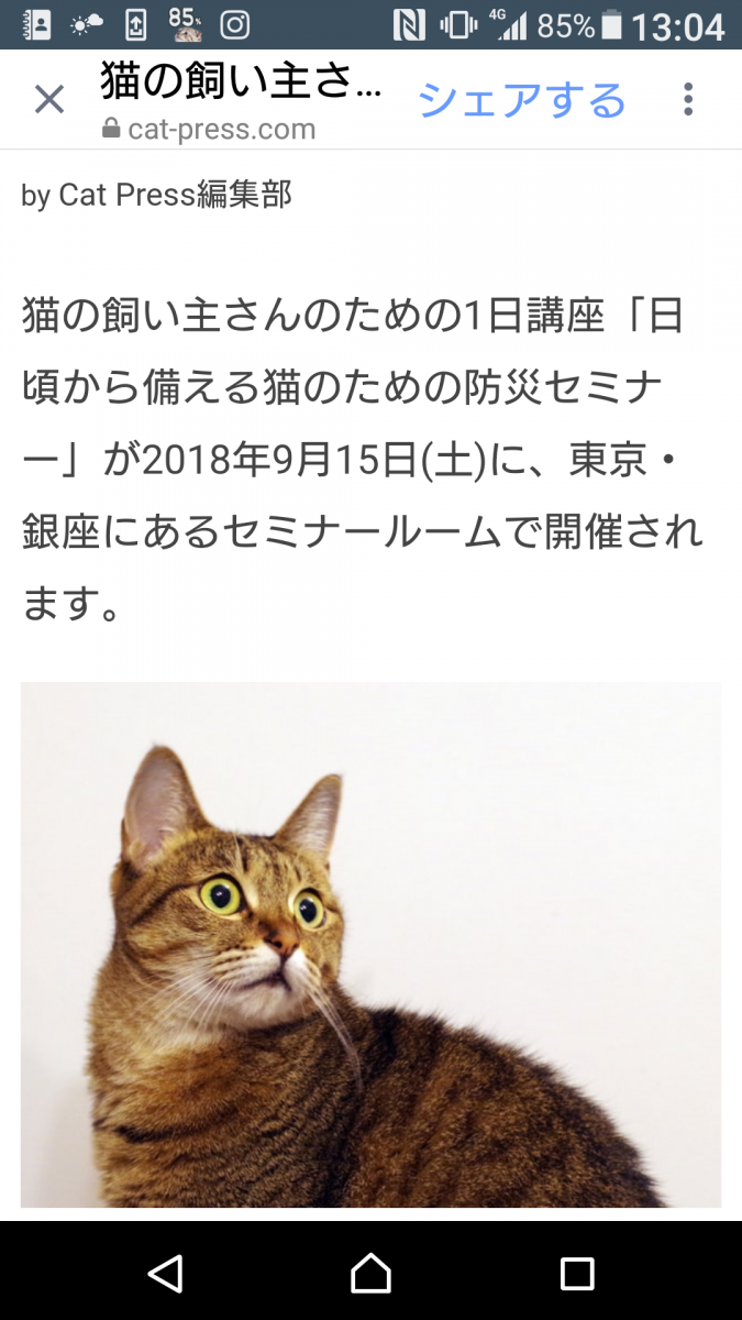 東京で行われる猫の飼い主さんの為の防災セミナーがあります。