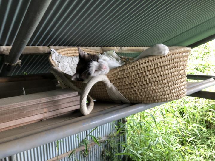トラ白は、湿気た毛皮を風にさらし、思い思いの場所でくつろいでいた。