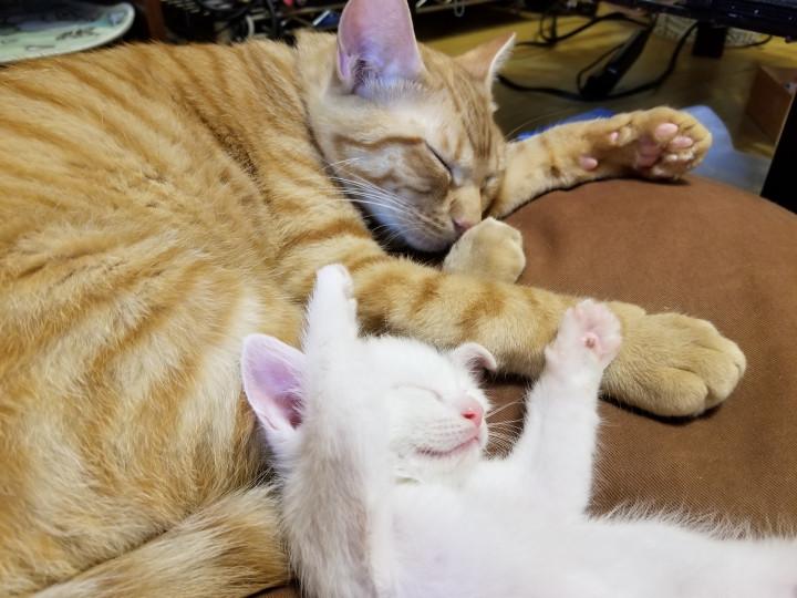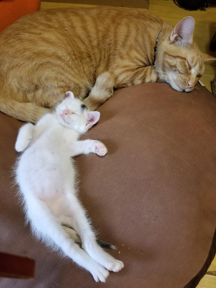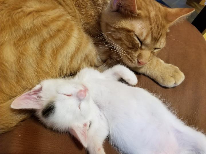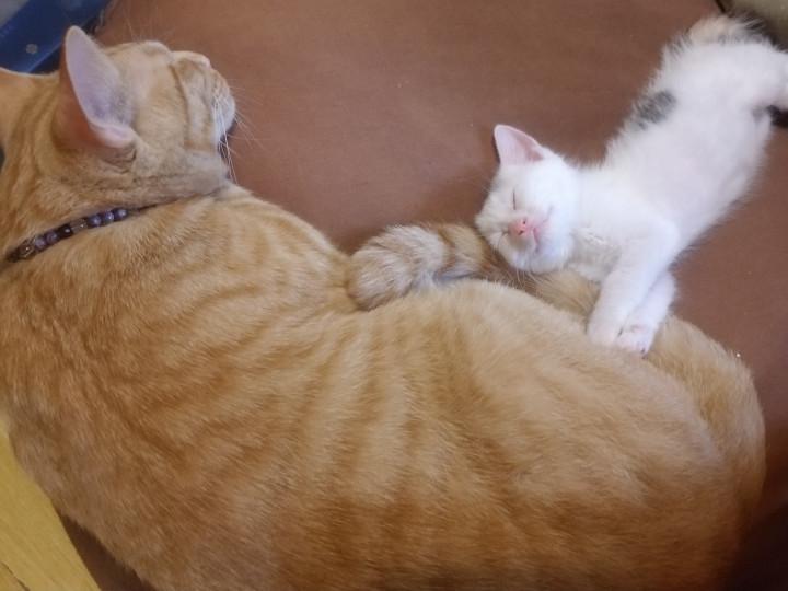ちびっ子過ぎて、オスカーは遊びたくて甘噛みしたりするけれど、まだヨチヨチ歩きのレティ。