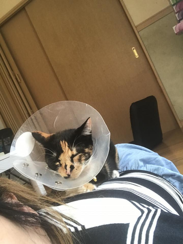 そして、エリザベスがあるおかけで、大好きな肩に乗れないから、背中の上に乗ってあげるの❤️