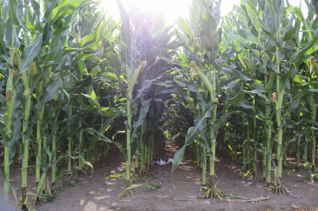 目の前のトウモロコシ畑に消えていく。