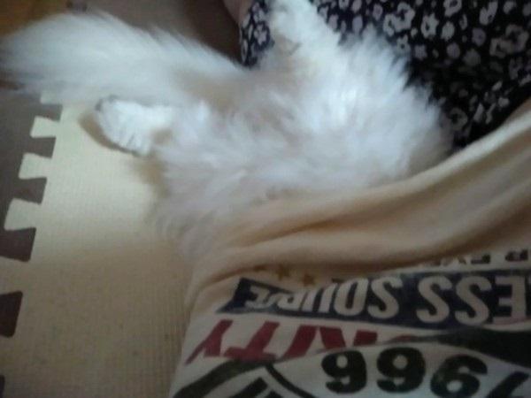 私が朝から寝転んでスマホをいじっていたら、中に潜り込んできましたよ。