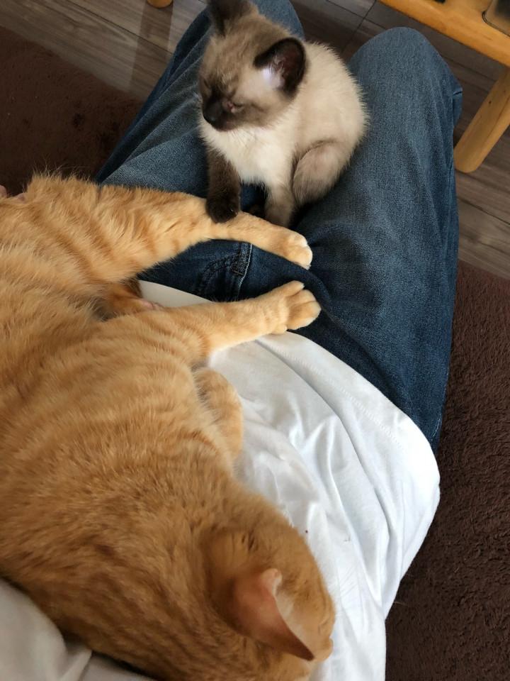 来た当初は、先輩猫に手を出され震えてたり、風邪を引いてもしかしてダメかと思った時もありましたが、何とか今の生活に慣れ、いつも一緒にいてくれて色々お世話してくれる猫と仲良しです。