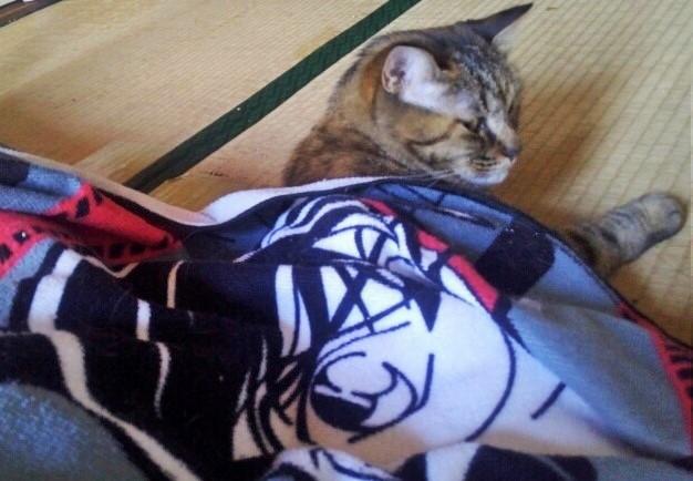 横になった私に添い寝しにきたメロについでにタオルかけてあげました。