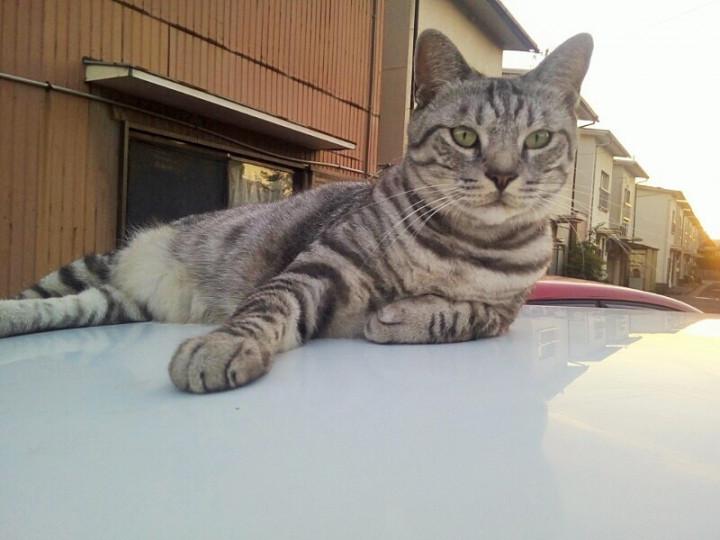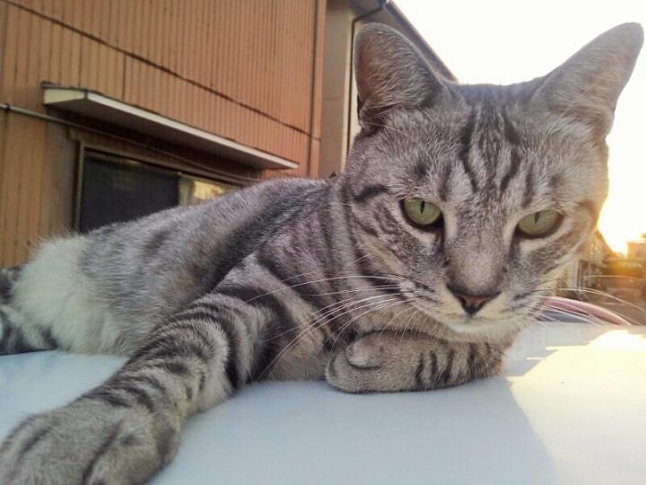 夕方、ゴミを捨てに家の前に出ると、私の車の上に乗っかってた隣の猫のトムくん。