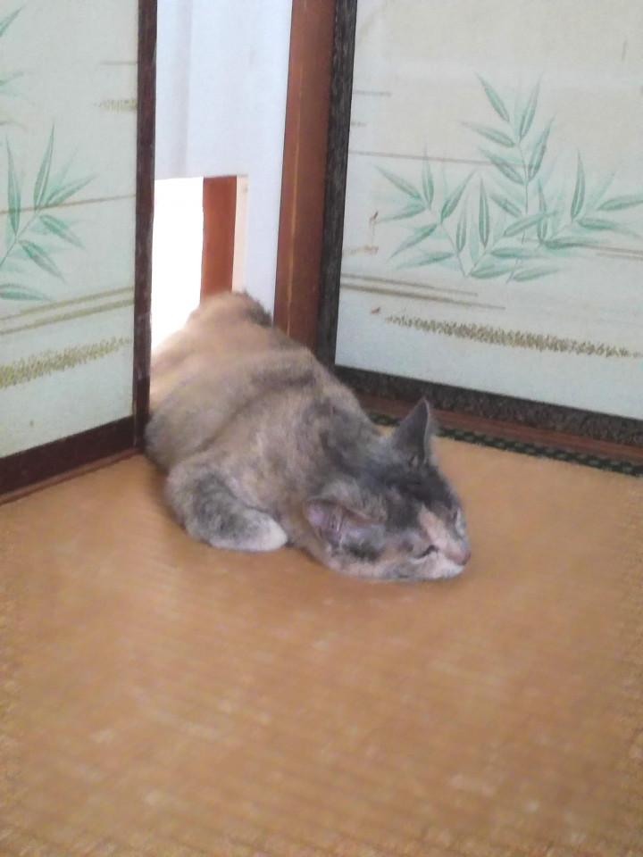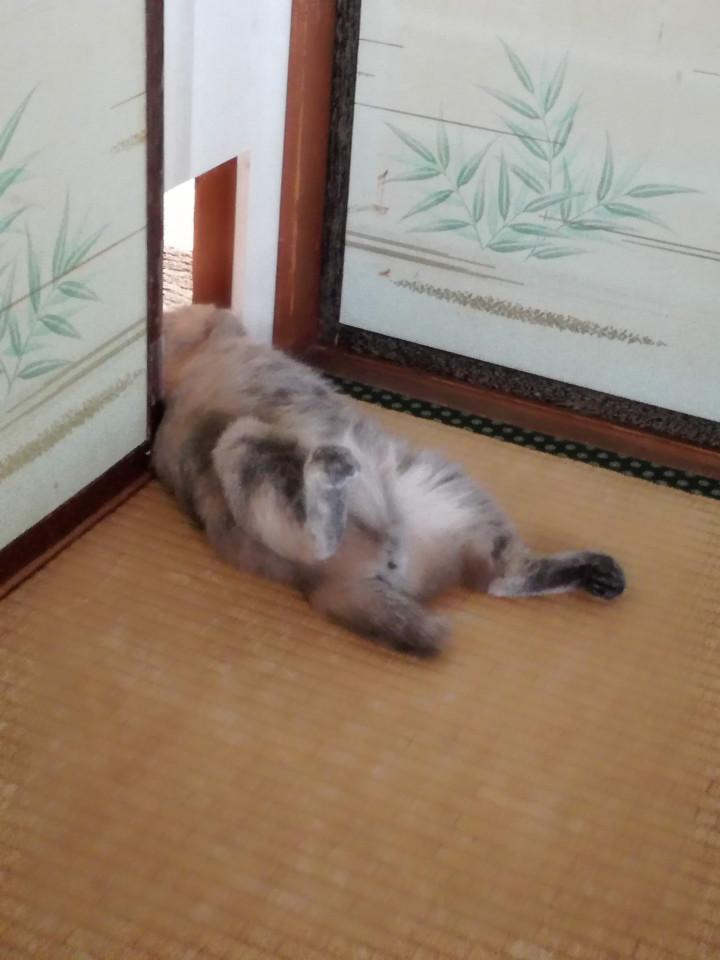 クーラーの冷気対策で猫扉っぽいのを作ったんだけど、どうしてそこで寝るのかな…(^_^;)