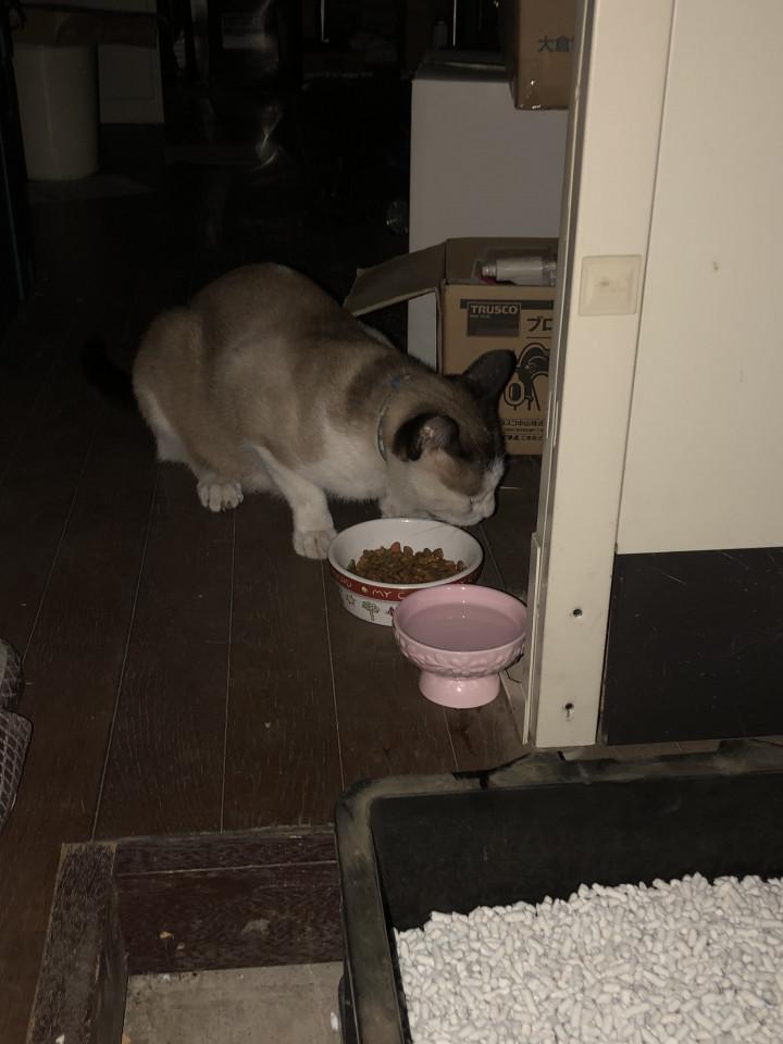 さっそく美味しいカリカリの入った器と、お水を持って行く。