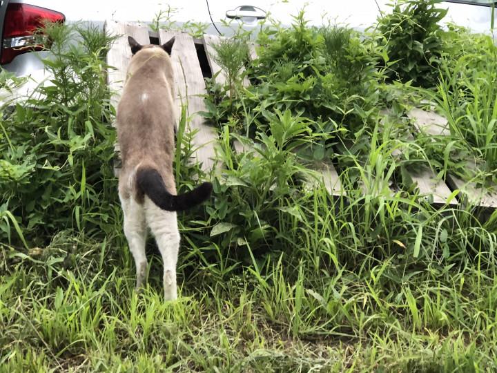 あっという間にご機嫌が治った白、庭に放置してある木製パレットでガリガリ爪を研ぐ。