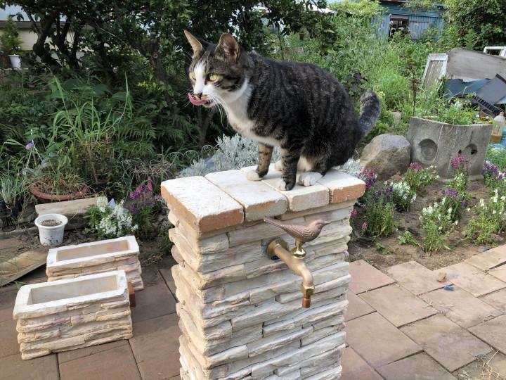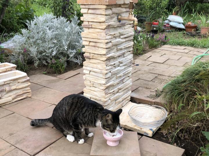 トラちゃん、今度からお庭のお水はこのガラスの器を使って飲んでね。