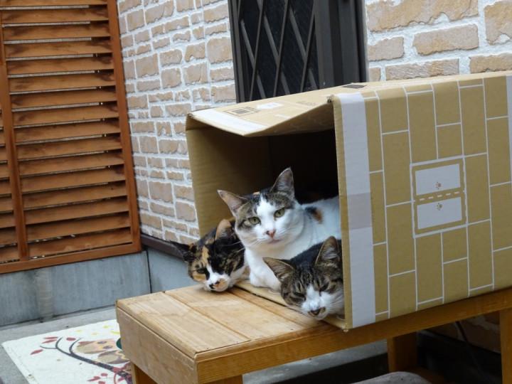 レモン親子は、暑さに平気で、土間をのぞいたら3匹仲良く箱に入っていました。