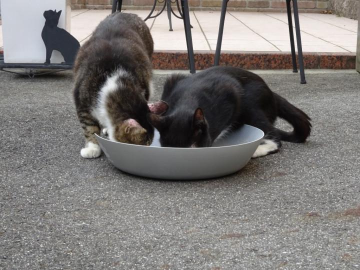 母屋裏口からお家においで~と誘っても、ご飯だけ食べて出て行っちゃいます。