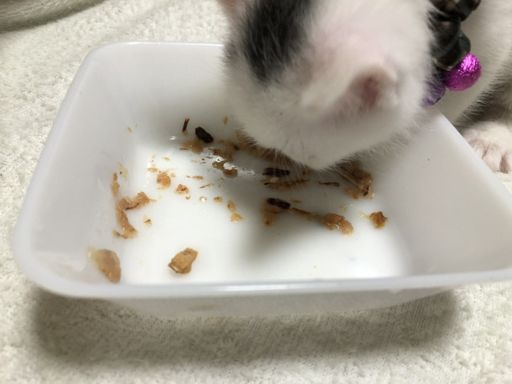 シロ子の食べてるパウチを一口手で入れるとすごい顔して嫌がります…(;´Д`A