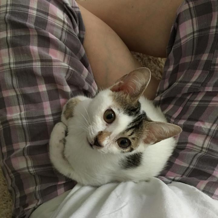 膝の上に、チョコンと乗るのが好き。あぐらをかいていると、スッポリはまります