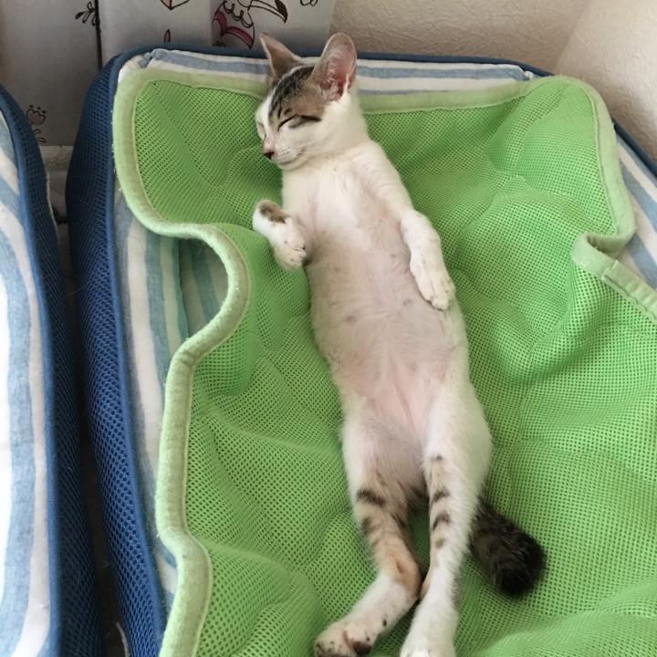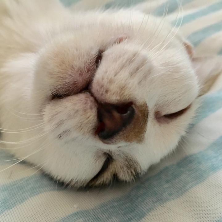 真っ白で、ピンクの肌が透けてるお腹(^^)いちご大福みたいだね。お腹一杯ご飯食べたから、眠くなっちゃったね。