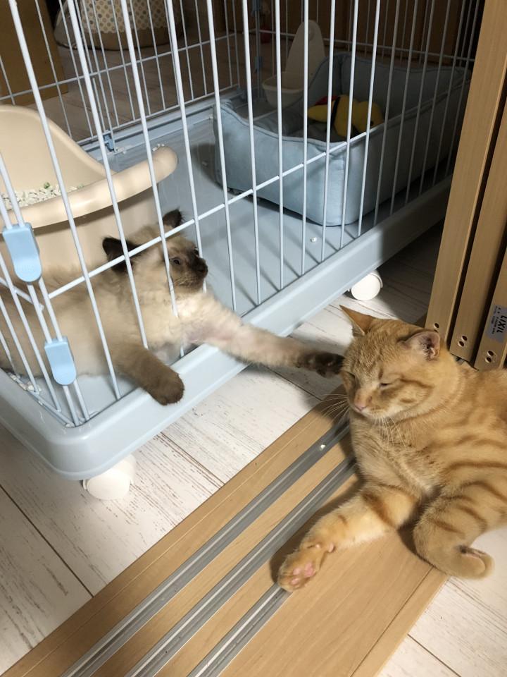 実際監視つきならケージ越しの触れ合いは大丈夫だろうと言う事で、冷風の取り入れも兼ねて引き戸を開放!