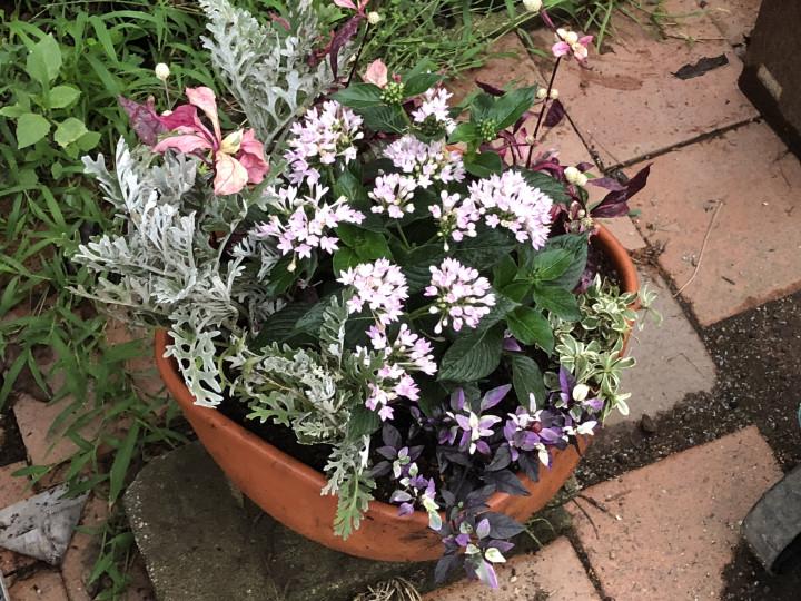 ちょうど昨日、ピンクのペンタスの寄せ植えを作ったところです。