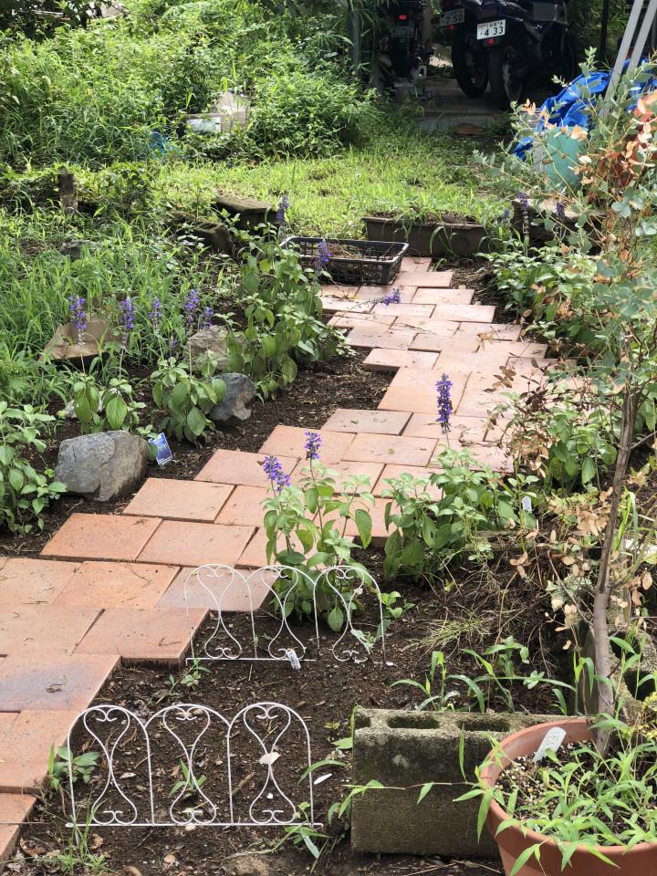 草を刈って、レンガを敷いて草を防ぐ作戦。