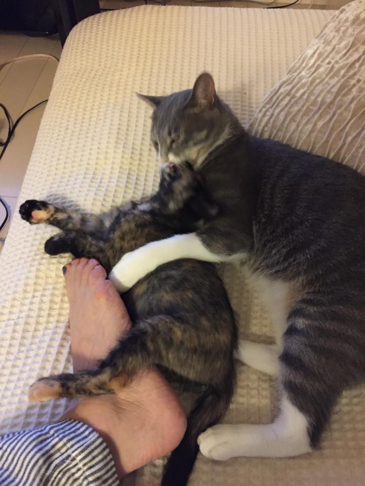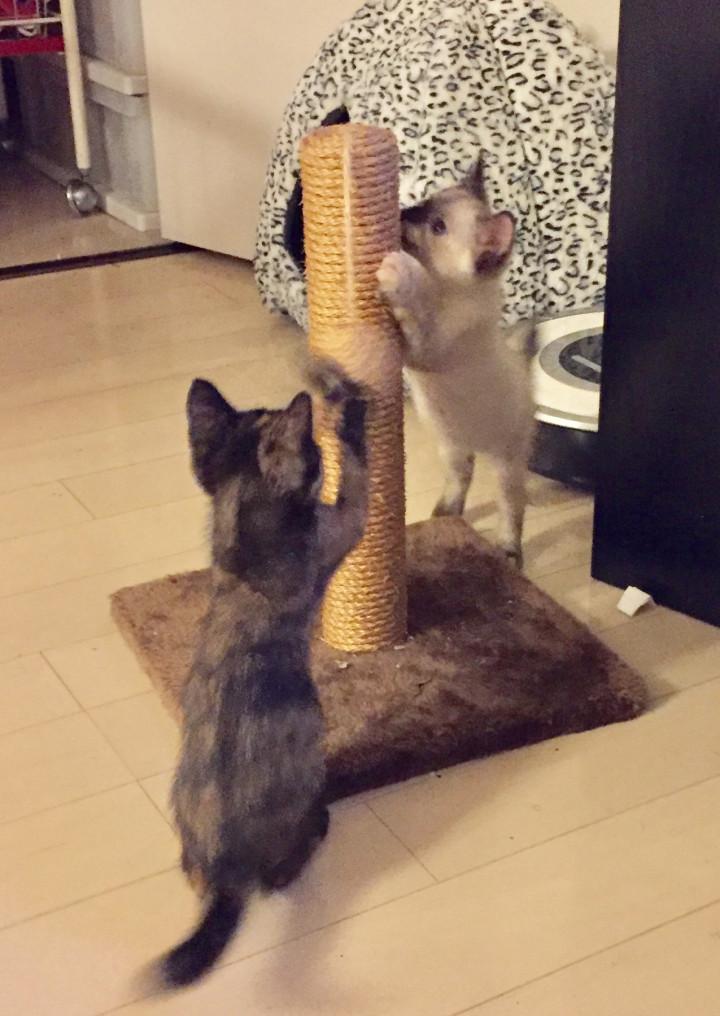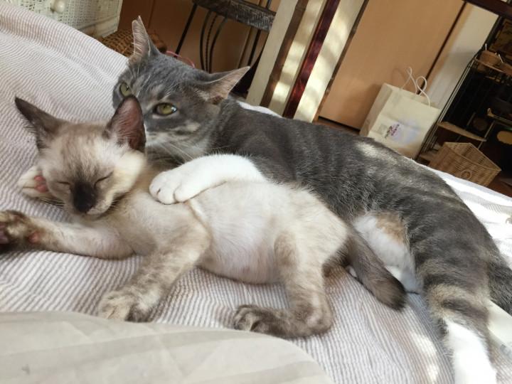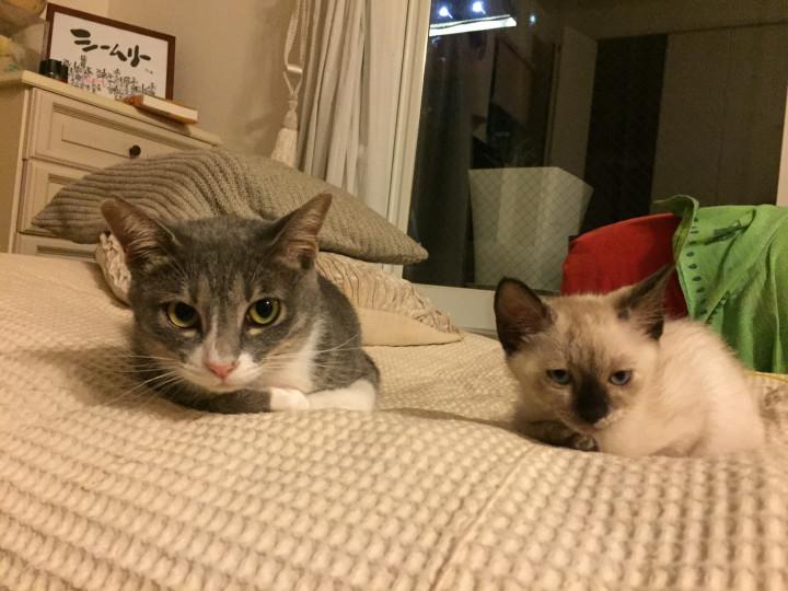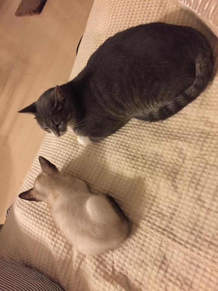 現在もうすぐ1歳になるエマちゃんと、トイプードルの老犬15歳二匹とも大人しく仲良しです。8月にハチとロクを迎えまして、朝方運動会を毎日しております。 エマちゃんが、猫語で、何やらニャ〜ニャ〜ウニャ...