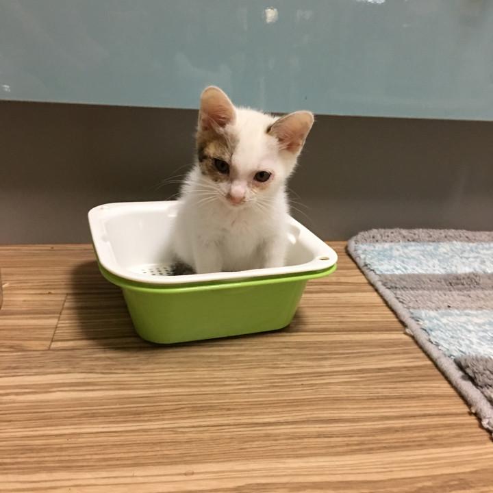 おもちちゃんは、ザルに入って、ご飯を待ちます。まだ、体重600gしかないけど、色々、学習してるようです。先住猫に混じって、ご飯を待つ姿は、可愛いです。